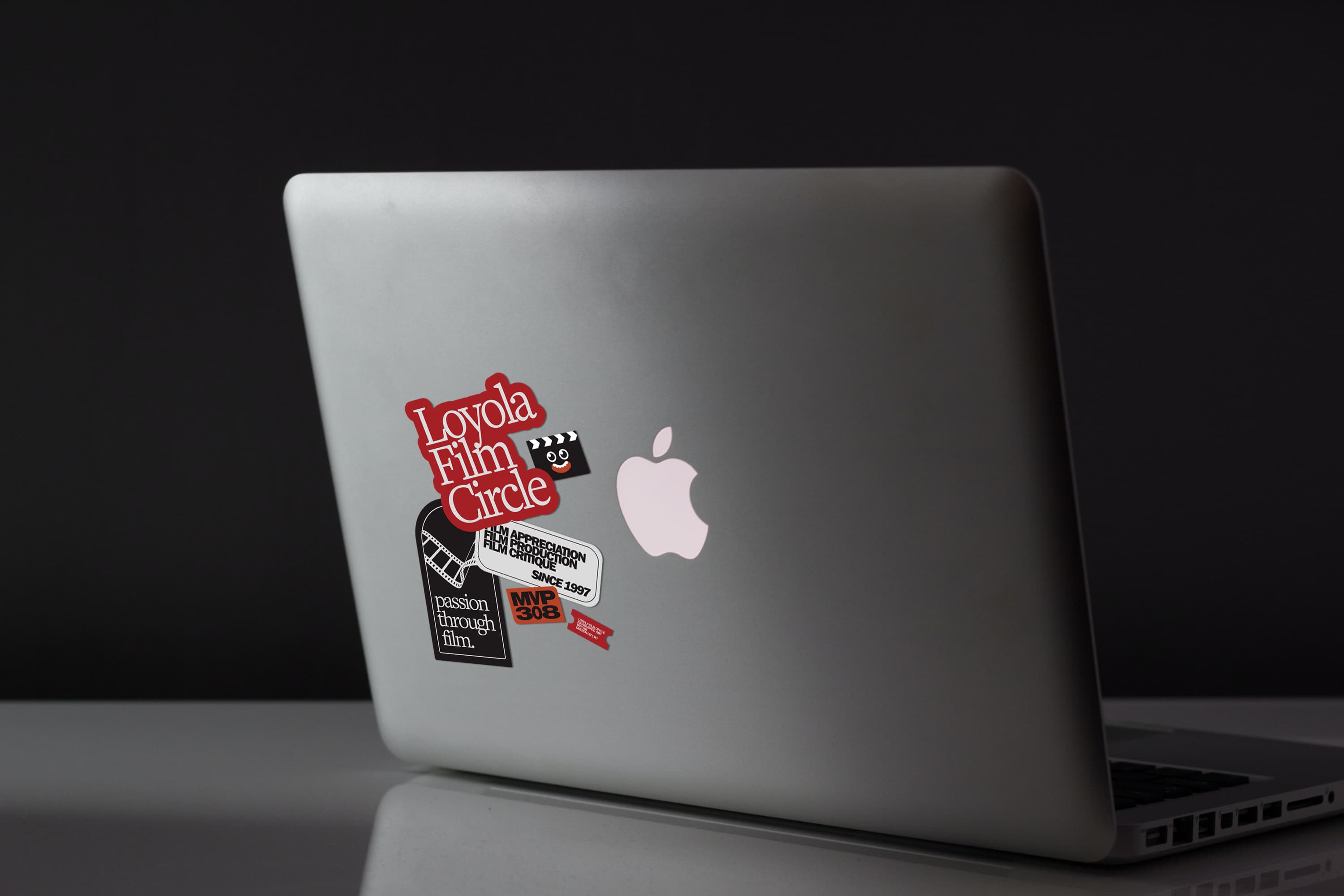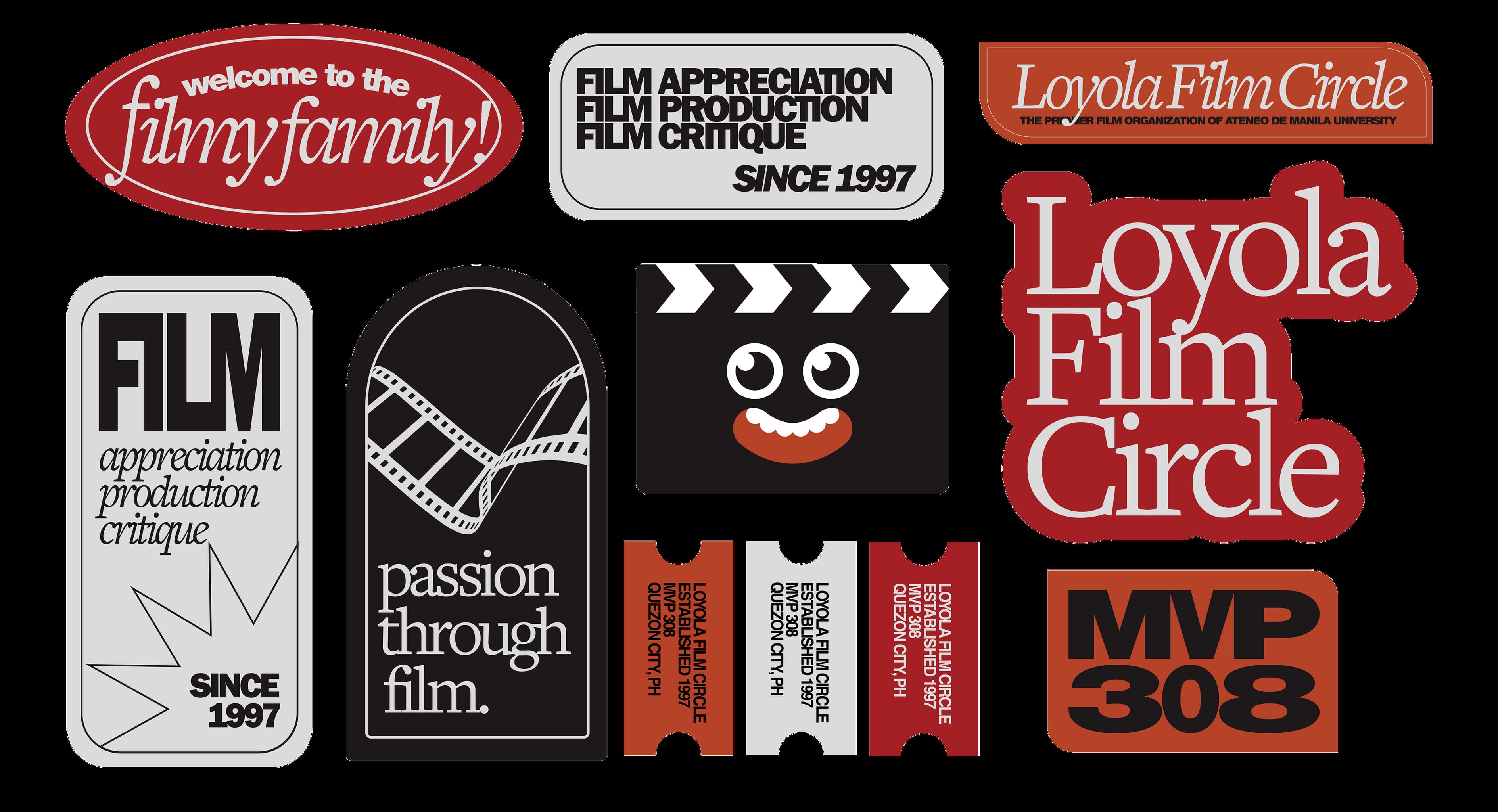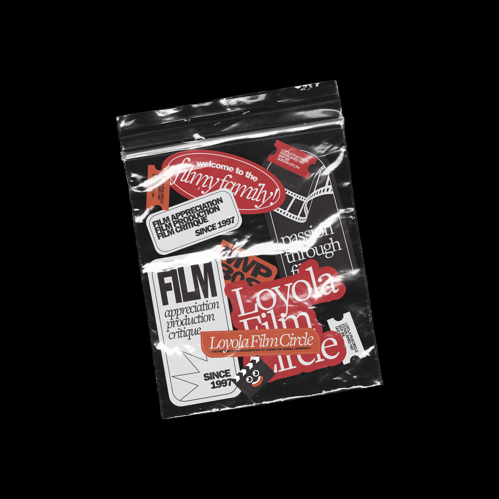 Merchandise concepts for Loyola Film Circle to be sold at events. The sticker pack includes designs with the organization's mottos and slogans, as well as their mascot Clappy. The shirt design shows back-heavy design of the organization's name and the front draws inspiration and references the popular film studio A24's shirt design.